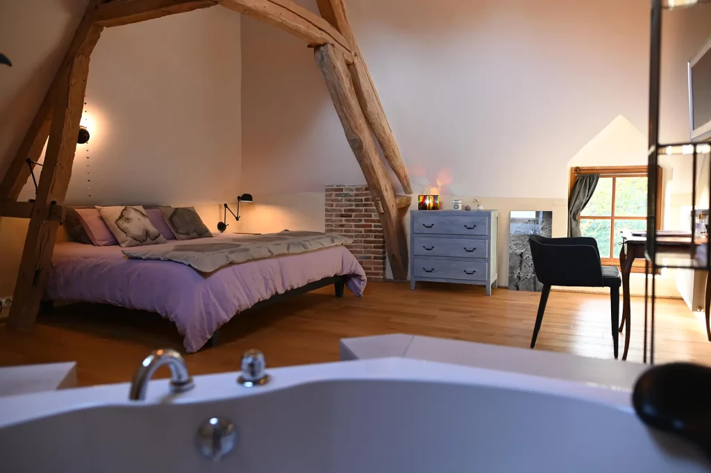 Camélia est une suite de charme, nichée au premier étage de l’aile ouest, cette Chambre d’hôte raffinée révèle un espace, glamour où la détente est maîtresse des lieux. Comprenant deux espace; le premier doté d’un petit salon pouvant faire office de chambre supplémentaire pour des enfants, ainsi que d’une salle de bain indépendante moderne et contemporaine disposant d’une douche confortable, d’un meuble de metier détourné fesant office de vasque et d’un toilette dissimilé. Le deuxième d’une grande chambre haute de plafond sous une magnifique charpent en trépant, donnant une impression de douceur. Muni d’un parquet en chênes apportant une atmosphère chaleureuse et dévoilant plusieur espace aussi confortable que pratique; lit spacieux, bureau, canapé, ainci qu’une magniphique baignoire balnéo permettant de vous ressourcer pleinement et de sévader du quotidien dans une atmosphère de pure sérénité.